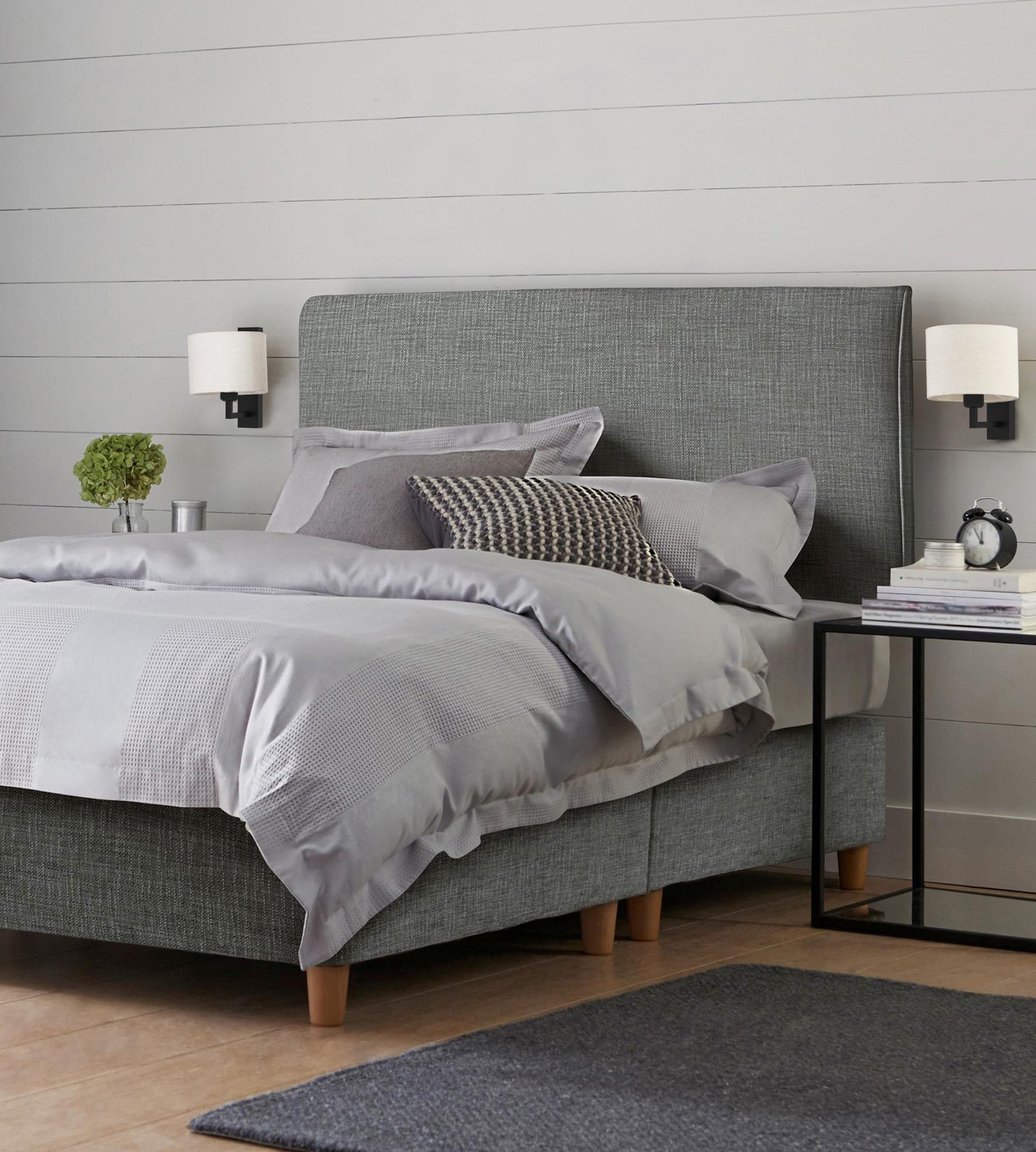 A sober and elegant look for this ROLLO wall light . Its thin steel arm blends wonderfully with the roundness of its white cotton lampshade. This wall light is available in two colors: gray or black. It can be installed with the arm up or down as desired. It is equipped with a USB port on the side. At the bedside on either side of a bed, in a corridor or in a coworking space for example, the ROLLO wall light discreetly adorns the walls and diffuses a soft and warm light. Product delivered without bulb.